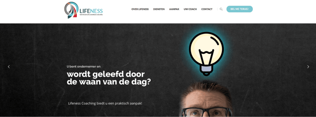 Website Lifeness coaching online: www.lifenesscoaching.nl! In 2017 werkte Cool Clogs een profileringsplan uit voor het nieuwe coachingsbedrijf van André van Wijlen. Er werd een naam bedacht, een logo en huisstijl ontwikkeld en uiteindelijk volgde in 2018 de oplevering van de website. Het is een overzichtelijke en duidelijke website geworden.