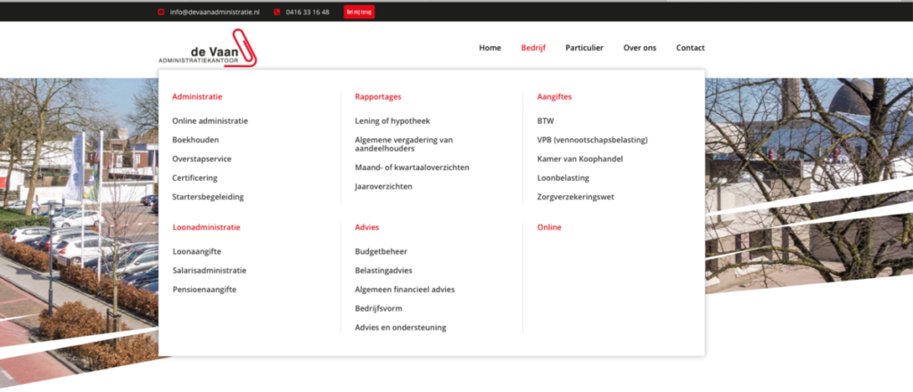 Er is een duidelijke keuze gemaakt om de site doelgroepgericht uit te bouwen. De verdeling zakelijk – particulier geeft per doelgroep aan voor welke services cq. diensten men terecht kan bij De Vaan Administratie. Heel overzichtelijk, gestructureerd en duidelijk. Dat past ook bij de no-nonsense werkwijze en aanpak van dit administratiekantoor. Alle elementen komen perfect samen op de website: www.devaanadministratie.nl.